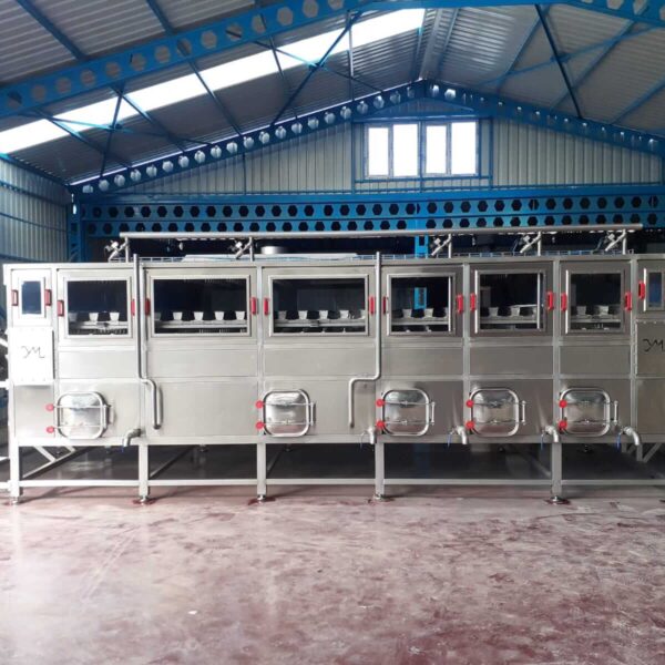 Cam şişe yıkama makinesi, 5 aşamalı olarak toplamda 32 istasyon yıkama ile cam şişelerinizi yıkamaktadır.